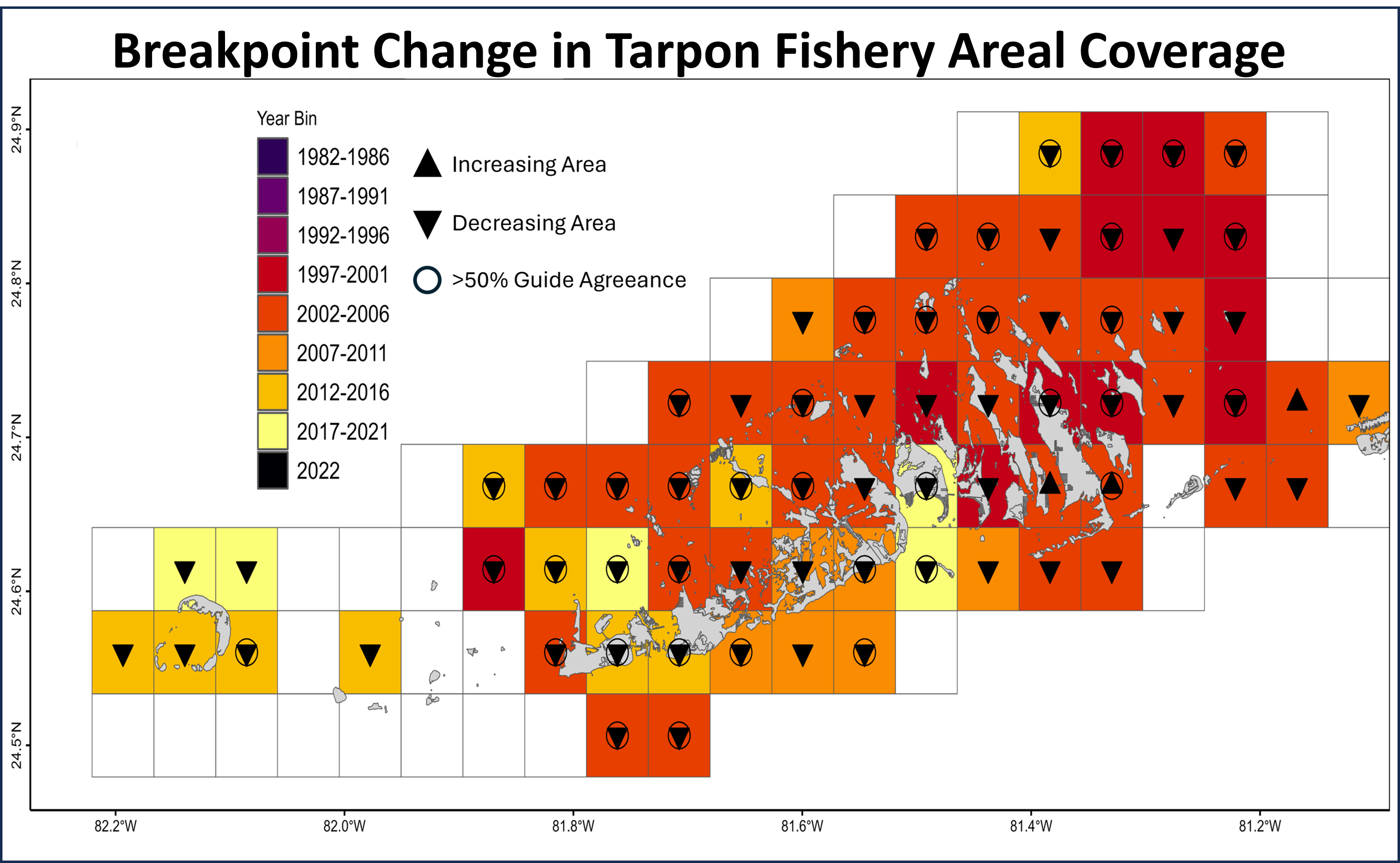 The analysis of the guide-drawn fishing maps resulted in identifying when and where declines began to occur in the Lower Keys Tarpon fishery.