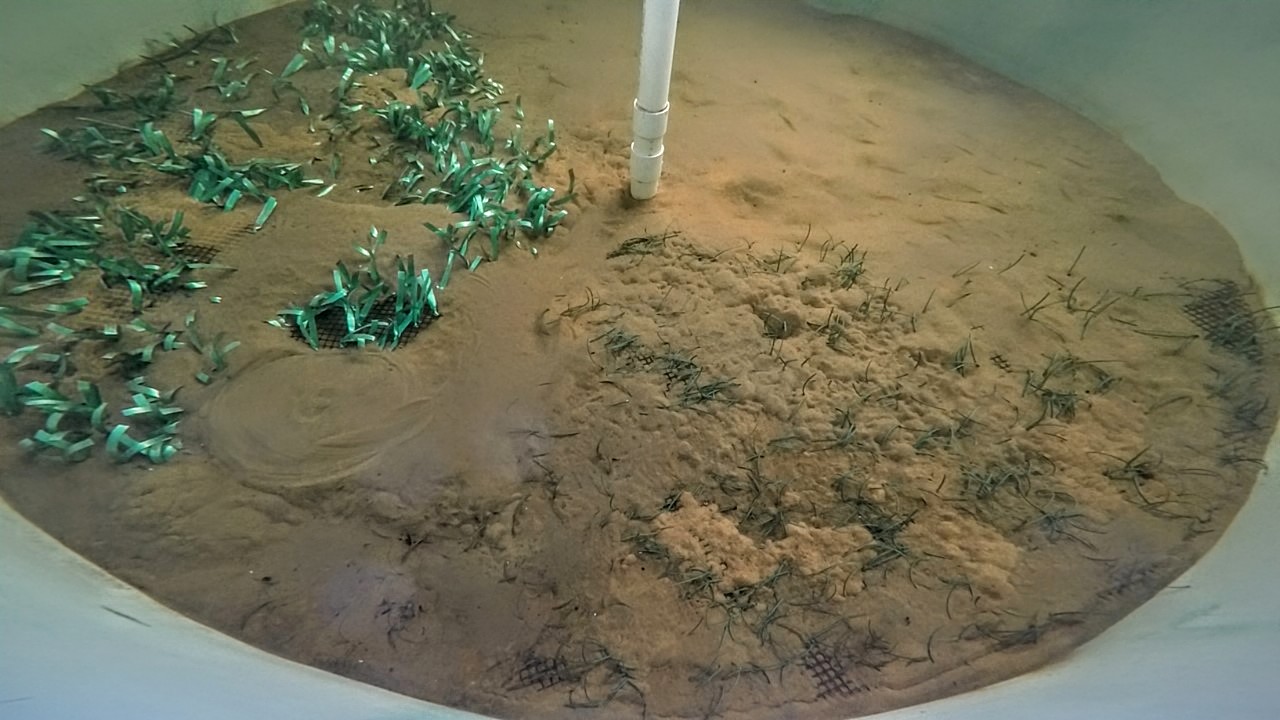 With the help of the whole Ajemian lab, we tied artificial seagrass shoots in a randomized pie-grid at 250 shoots per meter squared.